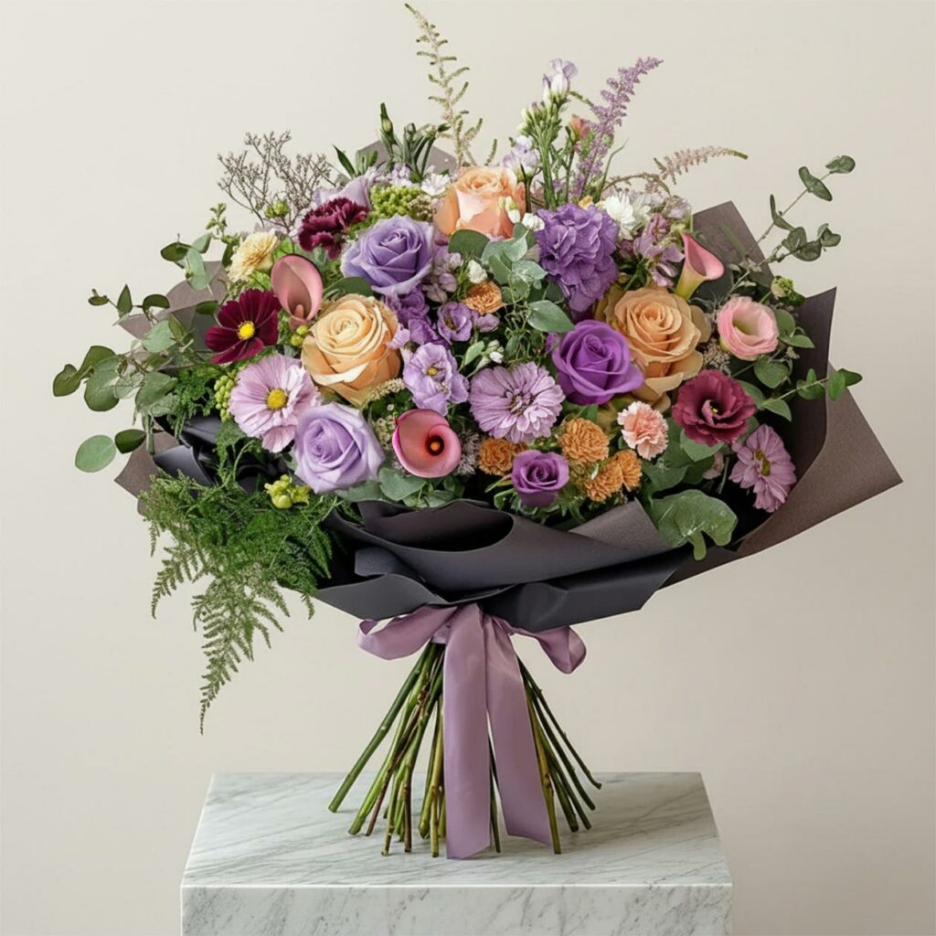 In this elegant arrangement, delicate blooms sway gracefully beside soft violet petals, each one a quiet verse in a heartfelt poem of love and deep appreciation. The lavender, vibrant yet tender, sings of a mother’s nurturing warmth.
